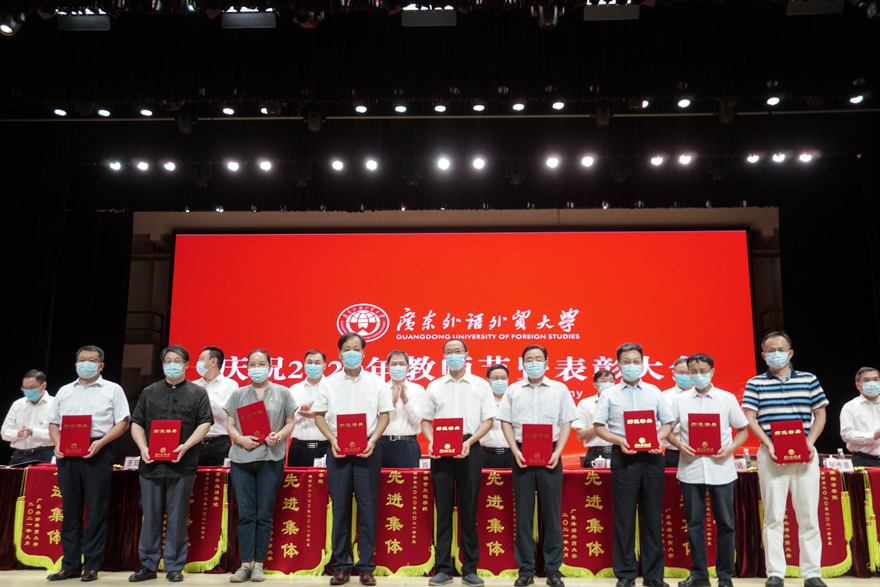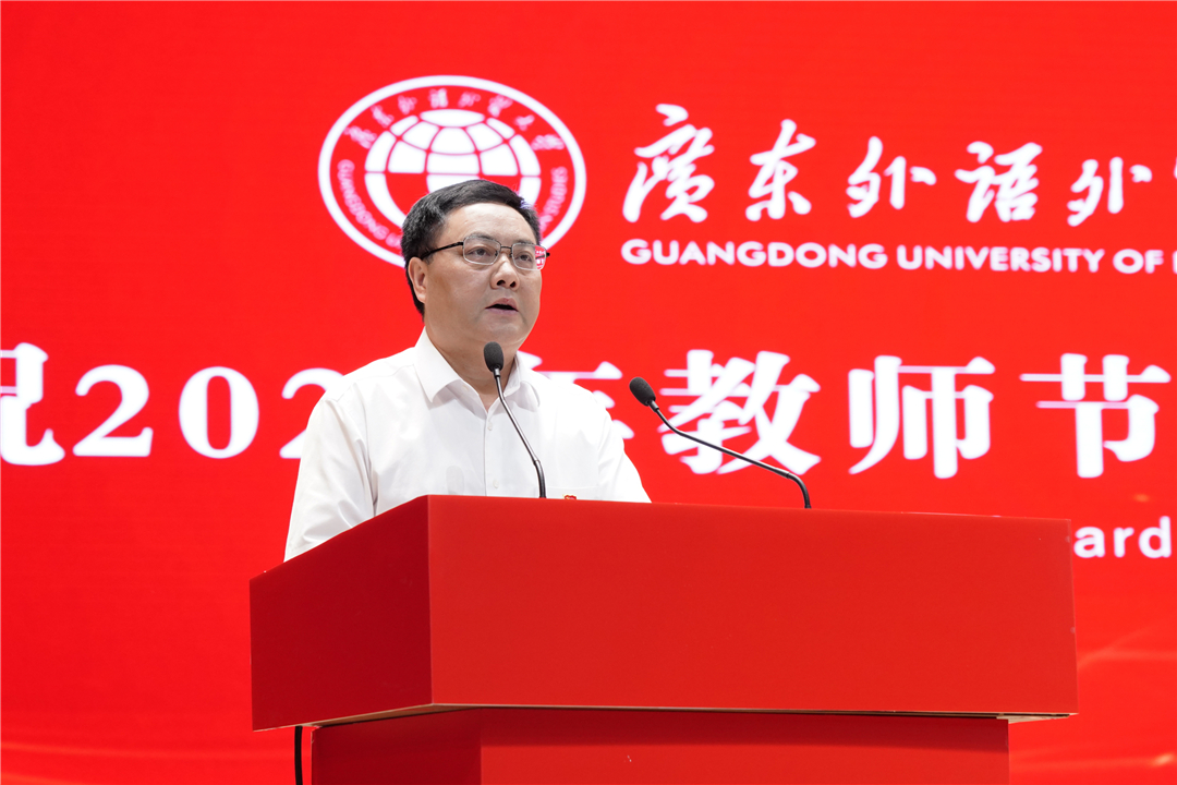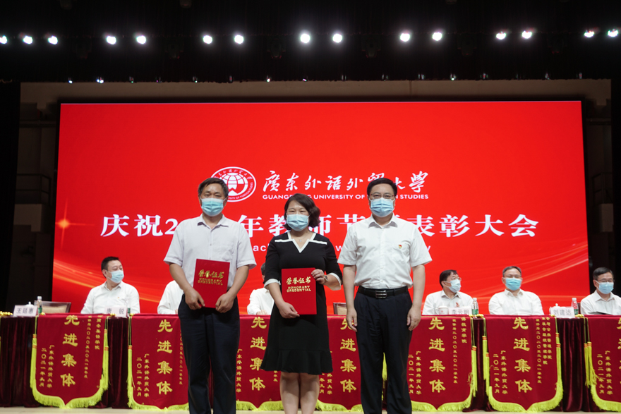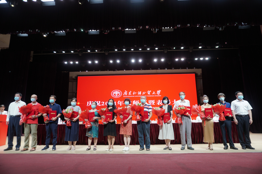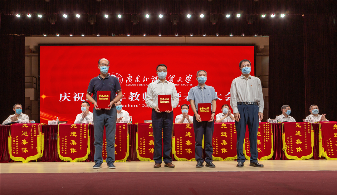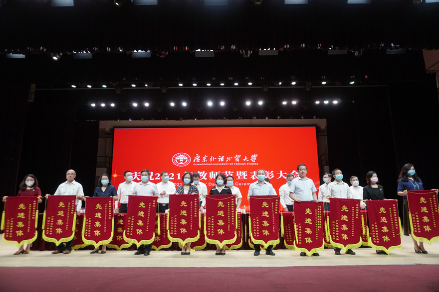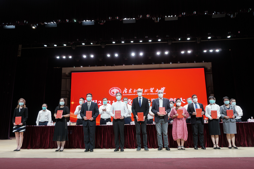 在颁奖环节,隋广军为南粤优秀教师(教育工作者)颁发荣誉证书;石佑启为广东省高等学校教学名师颁发荣誉证书;校领导为第二届“师德标兵”颁发荣誉证书,为先进集体颁发锦旗,为优秀境外教师颁发荣誉证书。隋广军和石佑启为2020年9月1日至2021年8月31日期间退休人员代表颁发荣休证书。