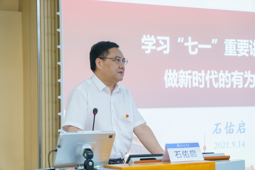 石佑启深刻阐释了习近平总书记在庆祝中国共产党成立100周年大会上的重要讲话精神的丰富内涵,深入解读了中国共产党在实现中华民族伟大复兴进程中取得的伟大成就和实现中华民族伟大复兴必须坚持的成功经验,阐述了作为中国共产党的精神之源的伟大建党精神的深刻内涵,并重点解读了“九个必须”作为实现民族复兴的伟大政治纲领的深刻内涵和时代价值。石佑启表示,“九个必须”是成功经验,是历史启示,是国之大者,是政治纲领,也是历史规律。石佑启还就实现中华民族伟大复兴征程上的青年使命进行详细阐释,寄语同学们厚植爱国情怀、坚定理想信念、锻炼品德修养、练就过硬本领、践行奋斗宗旨、担当时代责任。“士不可以不弘毅,任重而道远。”石佑启指出,学习习近平总书记“七一”重要讲话精神,就是要学深悟透、学思践悟,学出自觉自信,学出信仰信念,学出责任担当,学出能力水平。坚定“信仰和信念”这颗初心、练就“素质和能力”这身本领、鼓足“担当和奋斗”这股干劲、涵养“敬业和奉献”这种精神,在激扬青春、开拓人生、奉献社会的进程中书写无愧于时代的壮丽篇章,在实现中国梦的伟大实践中创造新的辉煌。