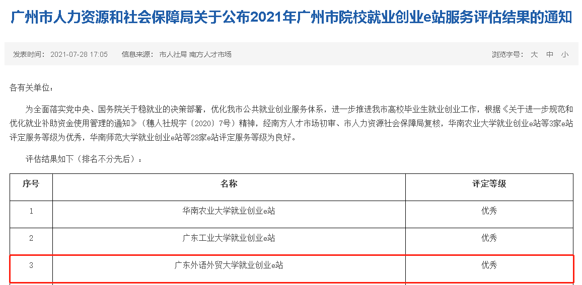 本网讯 近日,广州市人力资源和社会保障局公布了2021年广州市院校就业创业e站服务评估结果,我校就业创业e站被评定为“优秀”等级。本次评估中,全市31所院校设立的就业创业e站中仅有3所院校获评“优秀”等级。