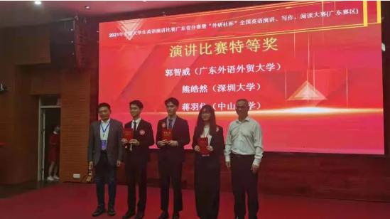 本网讯 11月6日至7日,2021年全国大学生英语演讲比赛广东省分赛暨“外研社杯”全国英语演讲大赛(广东赛区)全国英语演讲、写作、阅读大赛广东赛区复赛在韶关学院举办,吸引了全省66所高校629名参赛选手,参赛学校和选手数量均创历史新高。我校学子郭智威获全国大学生英语演讲比赛广东省分赛暨“外研社杯”全国英语演讲大赛特等奖,熊思颖、苏小慧获“外研社·国才杯”全国英语阅读大赛(广东赛区决赛)一等奖,陈敏获“外研社·国才杯”全国英语写作大赛(广东赛区决赛)一等奖。