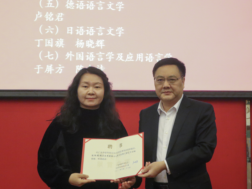 石佑启对新晋博士生导师表示祝贺,并向所有为学校学位与研究生教育工作作出贡献的博士生导师们表示衷心感谢。他指出,博士生导师是博士生培养的第一责任人,要深刻认识导师所承担的人才培养职责和使命,勤奋耕耘,砥砺奋进。石佑启和与会人员分享了四点体会:一是要言传身教,严谨治学,大力弘扬“进德、修业、务实、致远”的学风,以深厚学术造诣和先进教育理念提升博士生的科研创新能力;二是要以德立身,以德立学,以德施教,坚持“四为”方针,因应党和国家需求培养德才兼备的高素质人才,做有理想信念、有道德情操、有扎实学识、有仁爱之心的好导师;三是要转变观念,积极进取,博士生导师不是终身制,学校将进一步推行博士生导师评聘分离制度和导师组制度;四是要继往开来,传继薪火,立足学校发展新格局,秉承广外人攻坚克难、奋发图强的优良传统,助力学校研究生教育高质量发展。