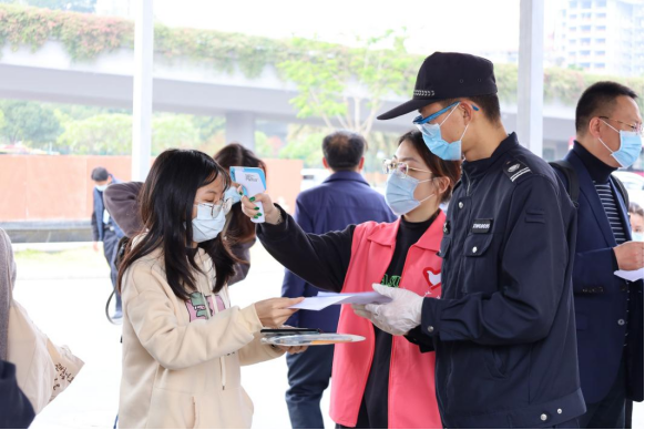 保卫人员和志愿者对考生进行入场健康核验