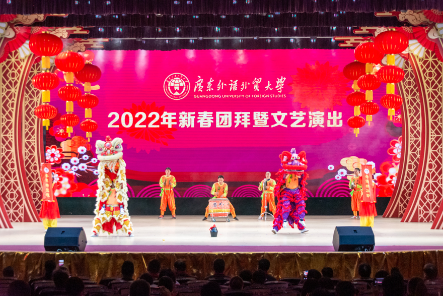五彩的灯光下,广外附设外语学校小学啦啦操团的孩子们配合着律动感十足的欢快节奏,带来了一场活力四射的花球啦啦操表演,向观众们传达出对于新春的美好祝福。艺术学院带来的舞蹈《芳华》,伴随着行云流水般的音乐,舞者们舞姿曼妙、身躯轻盈,用优美的舞姿诠释了军旅生涯的文工团女兵们那段无悔的青春年华。我校特邀嘉宾:广府人联谊总会创会会长、广州市振兴粤剧基金会创会会长、广州市原市长黎子流,广外客座教授、国际菁英会主席、广府人联谊总会执行会长胡智荣,以及广东省文联副主席、广东省戏剧家协会名誉主席、国家一级演员、著名粤剧表演艺术家倪惠英带来粤曲对唱《花田错会》《教育基金百万行》。婉转悠扬的唱腔,舒缓如流泉,绵长如春雨,余音袅袅,不绝如缕,展现了“世界非物质文化遗产”粤剧的神韵,也给今年的新春团拜晚会添上了特有的粤味。
