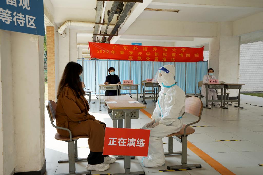 学校在北校区二教中庭、南校区学生宿舍1栋架空层和知识城校区学生宿舍1栋架空层分别开展了全方位、立体的综合应急处置演练。本次演练以某日我校收到疾控机构通报、在社区居民核酸筛查中发现学校一名学生核酸检测结果阳性为背景开展应急演练。演练内容包括:学校启动应急响应,紧急信息上报,实施校园管制,执行校园封闭封控,配合开展流行病学调查,初筛阳性人员转移,启动线上教学、后勤服务保障和师生心理疏导等,做到了对于情景的真实还原。