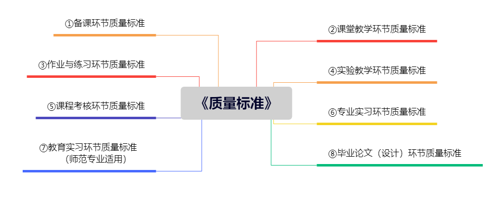《质量标准》明确八个主要本科教学环节的基本要求(如下图所示)。每个环节都对教师、学生、教学管理等提出基本要求,归纳出学校相关教学管理制度,提供合格、优秀两个等级质量标准,并对标准的使用进行说明。同时,给出参考性评价方案,以及教案、教学进度表等模板。