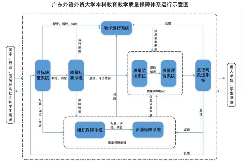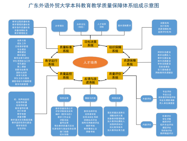 《总体方案》中所述的质保体系是一个完整的系统工程,由人才培养目标决策系统、组织保障系统、质量标准系统、资源保障系统、教学运行系统、质量监控系统、质量评价系统、反馈与改进系统等八个部分组成,各系统之间相互发生作用和影响,促成质保体系有效运行,如下图所示。