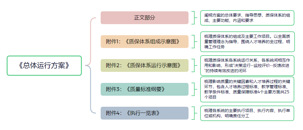 《总体方案》明确质保体系的组成和运行,回答学校本科教育教学质量保障体系是什么、保什么、谁来保、怎么保等问题,旨在建立全校统筹联动的质量保障长效机制。《质量标准》明确本科教学主要环节的基本要求,同时提供教学及管理的参考资料,旨在为教学管理提供参考性依据和指导性要求,促进各单位加强教学过程管理,规范教学活动,保证和提高教学质量。
