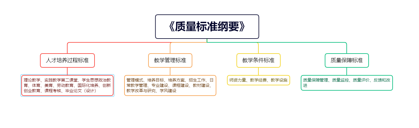 《质量标准纲要》梳理了影响质量的关键因素和人才培养过程的关键环节,根据学校人才培养目标和办学理念,在教育部《本科教学质量专业类国家标准》的基础上制定具有我校特色的指导性质量标准,主要包括四个主要方面共25个质量项目,如下图所示。《执行一览表》梳理了质量保障工作的主要执行项目、执行内容、执行单位或机构。
