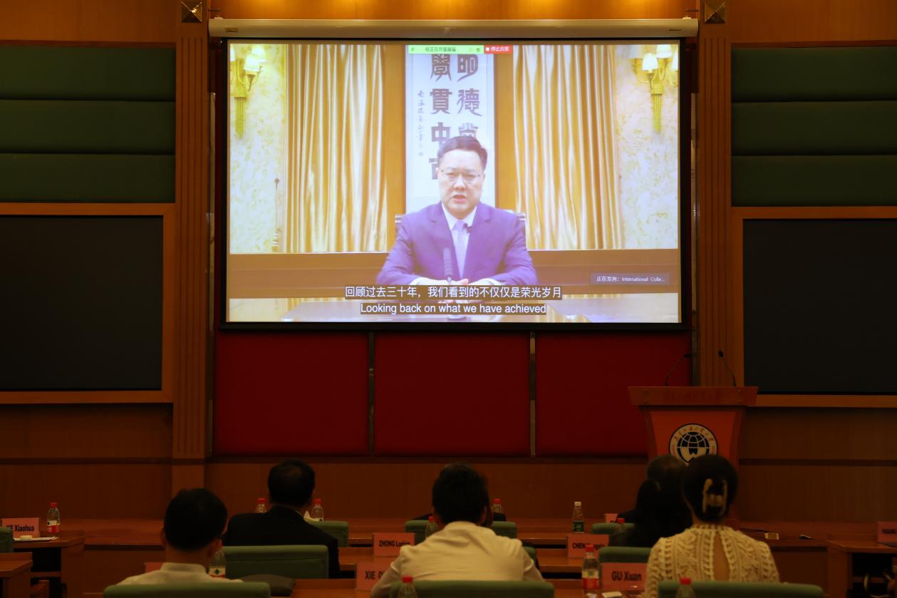 石佑启在致辞中回顾了两校合作关系建立。他谈到,三十年前,在邓小平南巡讲话精神的鼓舞下,兰开夏代表到访广外探讨两校合作项目,率先创办了国际化特色鲜明的人才联合培养新模式,共同打造了中国出国留学培训项目的典范。悠悠三十载,一代芳华成。回顾过去三十年,我们看到的不仅仅是荣光岁月,更是一个个鲜活的教师、学生、校友,正是他们,共同创造了两校这段国际教育光辉历程。展望未来,广外将继续一往无前,在新时代担当作为。最后,石佑启祝愿两校在教育国际化发展事业上共创更大辉煌。