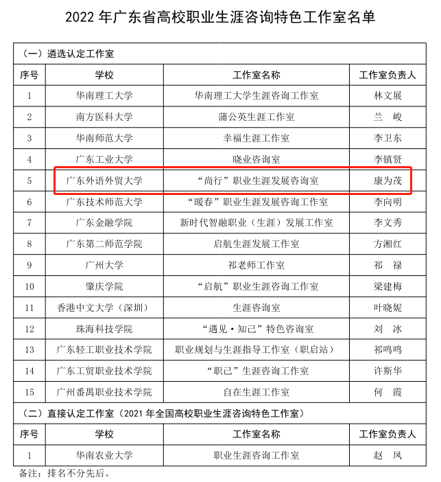 本网讯 近日,广东省教育厅公布了2022年广东省高校职业生涯咨询特色工作室名单,我校“尚行”职业生涯发展咨询室成功入选。据悉,全省共16个工作室获评。