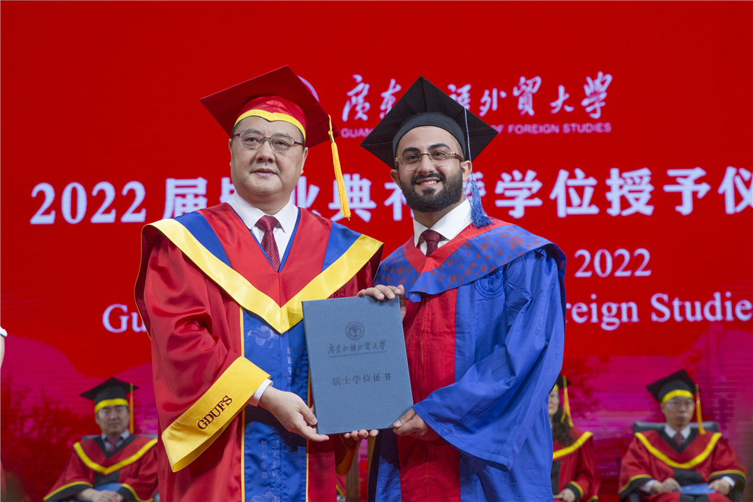 从校长手中接过学位证书的那一刻,毕业生们感慨万千,心中不仅充盈着对大学时光的依依惜别,更饱含着对未来的憧憬。英文学院博士毕业生蔡祎感慨道:在广外的七年里,角色在不停地转变,但不变的是对母校的热爱与自豪。希望自己在未来能秉持广外价值观不断向前,勇闯人生新征程。翻译学院硕士毕业生高文瑾表达了对毕业生们的美好祝愿:“轻装策马青云路,人生从此取长风,愿我们既有前程可奔赴,也有岁月可回首。”西语学院硕士毕业生黄玫表示,老师们不仅仅传授他们知识,更是在人生路上给予他们指导。来自留学生院的硕士研究生那佳木(Rashad Najman)对老师、同学的帮助与鼓励表达了真挚的感谢,“人生就像一场旅行,毕业不是终点,而是新的起点。感恩母校,感恩广外,未来我将继续努力。”