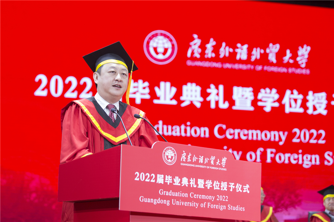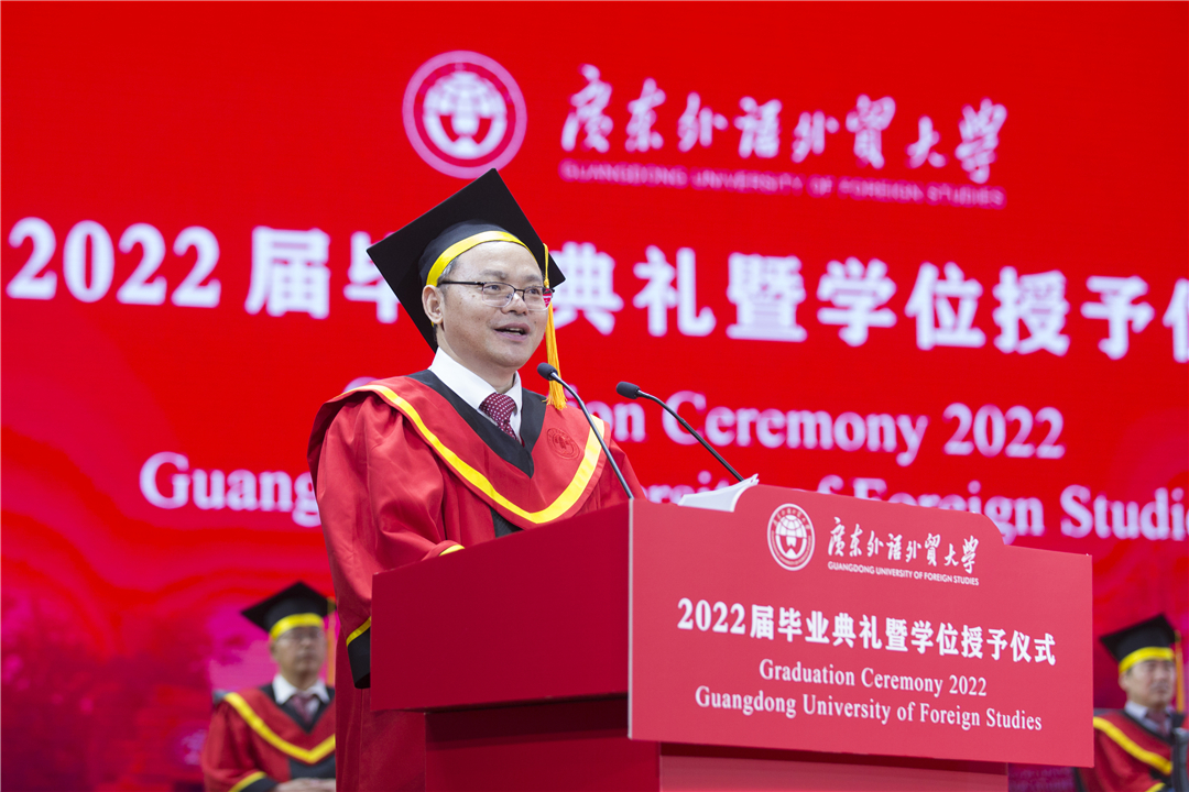 石佑启援引广外多位优秀教师、校友动人事迹,为毕业生上好最后一课。他带领毕业生们回顾了学校近年来的建设发展成就,回忆了丰富多彩的在校生活,勉励毕业生们让个人选择与时代脉搏同频共振,拥抱时代之变,以实干笃定前行。