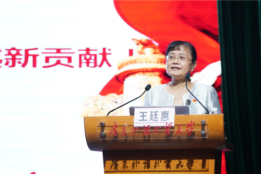 报告会上,王廷惠以《以新作为干出新气象 奋力为广东“走在全国前列”作出卓越新贡献》为题,从“深刻领会、准确把握大会意义”“深刻领会、准确把握主要内容”“笃实践行、新征程干出新气象”三个方面,全面介绍了省第十三次党代会的基本情况,系统阐述了省第十三次党代会的重大意义、丰富内涵、精神实质和战略举措。她指出,学习贯彻省第十三次党代会精神,就要做到高瞻“看远”,担当“为党育人为国育才”光荣使命,“跑好我们这一棒的高质量”,优化完善发展思路扎扎实实干;前瞻“谋深”,强化“时时放心不下”的责任感,弘扬“广外”卓越精神 ,细化落实方案踏踏实实干;精微“做实”,坚持“致广大而尽精微”,把握引领现代化发展的成事之道,深化实施“1+1+9”老老实实干。