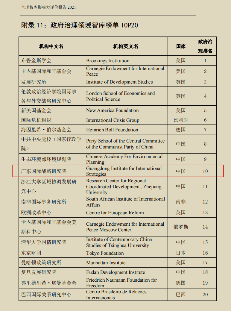 本网讯 近日,中国工程科技知识中心与浙江大学信息资源分析与应用研究中心智库研究小组发布《全球智库影响力评价报告2021》,我校广东国际战略研究院位列中国智库榜单第23位,是广东省唯一一家进入榜单前30名的智库,并在政府治理领域智库榜单中位列全球第10位。
