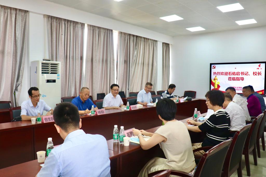 石佑启一行走访了国际关系学院与马克思主义学院,详细了解新生返校情况、开学筹备工作情况以及学院建设发展的成绩亮点、存在问题等。石佑启对国际关系学院与马克思主义学院的发展成果予以肯定,勉励学院抢抓机遇、奋发图强,推动学校各项事业高质量发展。为此,他提出五点要求:一是以学科建设为龙头,以专业和平台建设为抓手,不断提升核心竞争力;二是以党的建设为引领,抓好“四风”建设,提振教职工奋发有为、干事创业的精神气;三是把高素质人才队伍建设作为发展的根本点,在引进和培养人才方面下“硬功夫”,进一步建立健全人才工作机制;四是将人才培养视为学校高质量发展的生命线,主动适应新发展要求,创新人才培养体制机制;五是切实筑牢安全防线,扎实做好疫情防控工作,全力保障校园安全稳定。