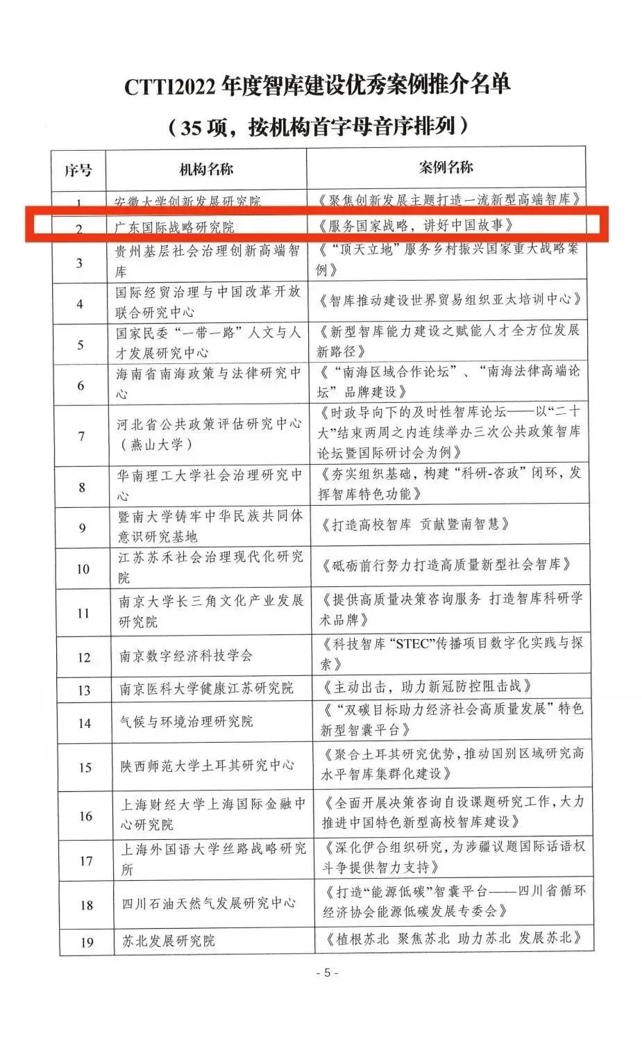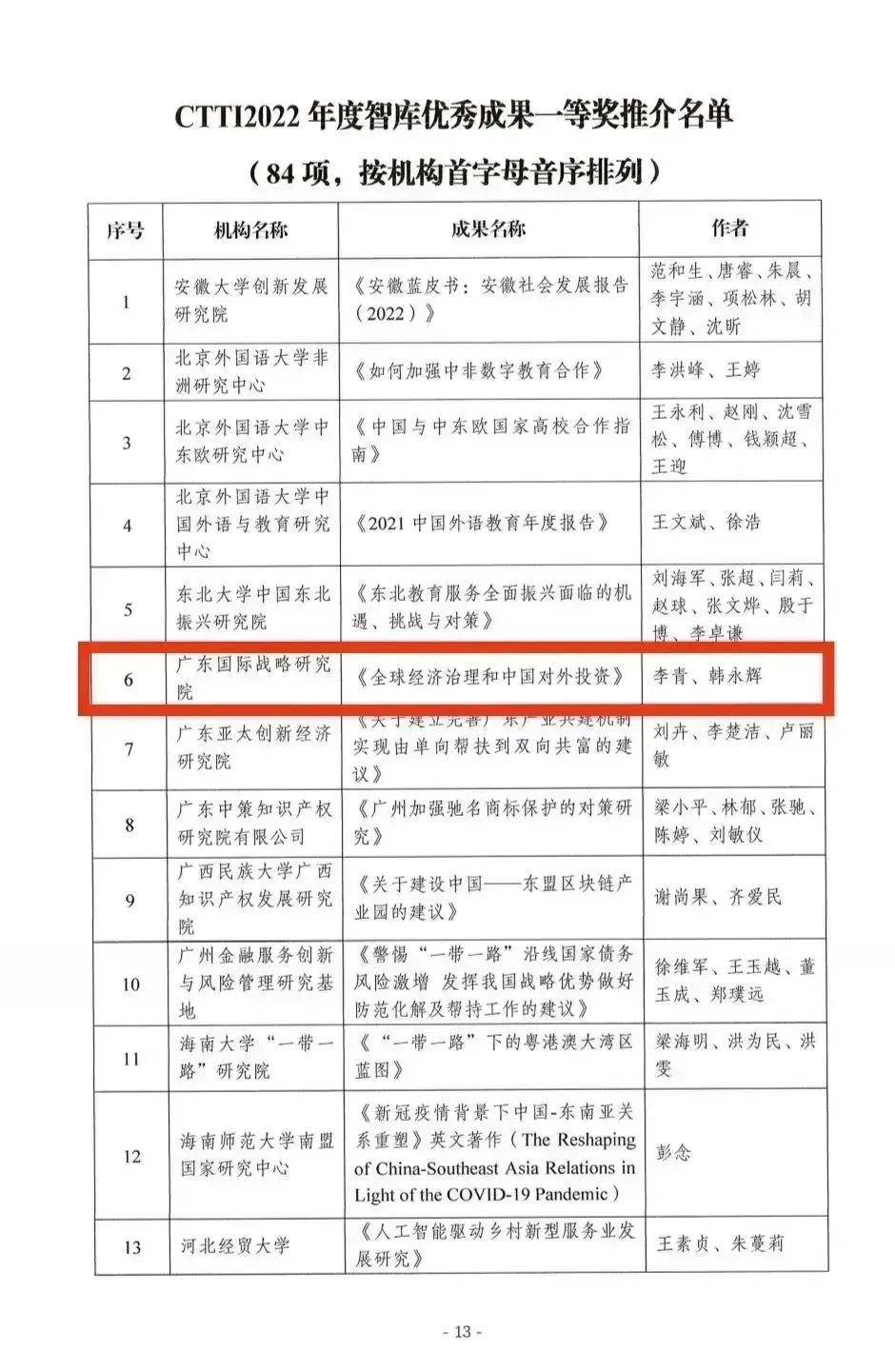 本网讯 12月17日,南京大学中国智库研究与评价中心公布了CTTI2022年度智库最佳案例与优秀成果推介名单。我校广东国际战略研究院智库建设案例《服务国家战略,讲好中国故事》入选CTTI2022年度智库建设优秀案例;战略研究院秘书长李青教授与院长助理韩永辉教授合作撰写的专著《全球经济治理和中国对外投资》入选CTTI2022年度智库优秀成果一等奖。