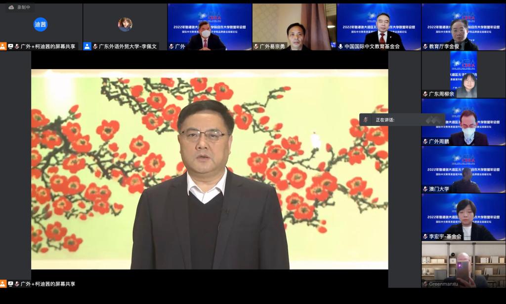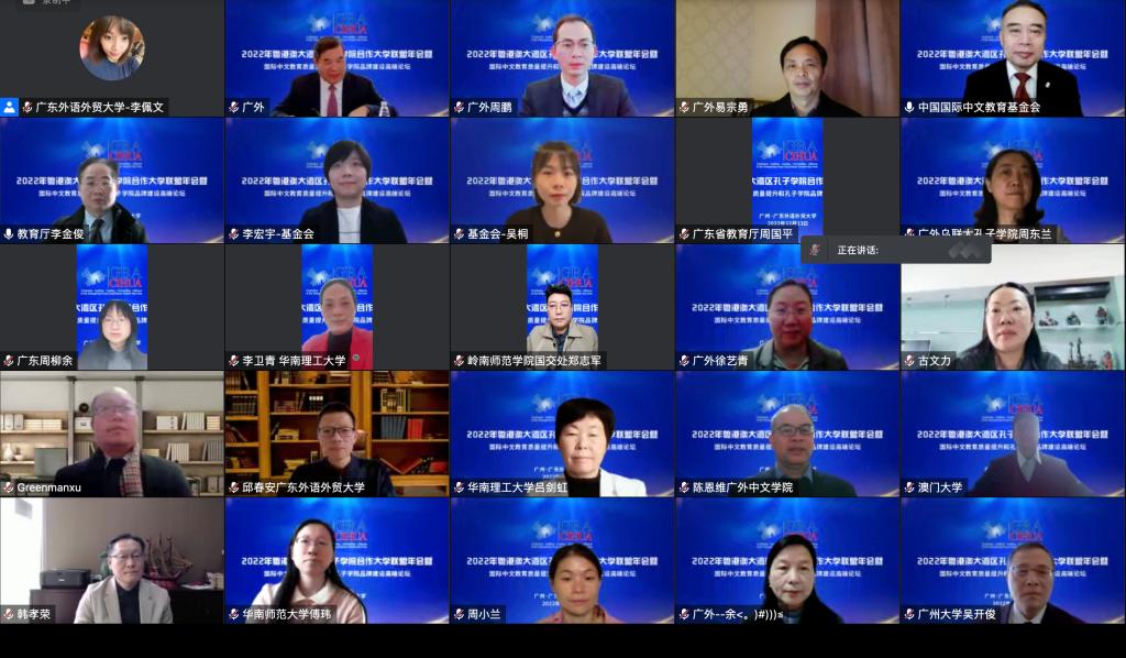 本网讯 12月23日,由我校承办的2022年粤港澳大湾区孔子学院合作大学联盟(以下简称“联盟”)年会暨国际中文教育质量提升和孔子学院品牌建设高端论坛(以下简称“论坛”)在线上举行。中国国际中文教育基金会(以下简称“基金会”)副理事长、秘书长赵灵山,广东省教育厅一级巡视员朱超华,我校党委书记、校长石佑启,副校长焦方太以及来自香港理工大学、澳门大学、中山大学、华南理工大学、暨南大学、华南师范大学、广州大学和岭南师范学院共9所高校的61位参会代表参加了本次年会及论坛。