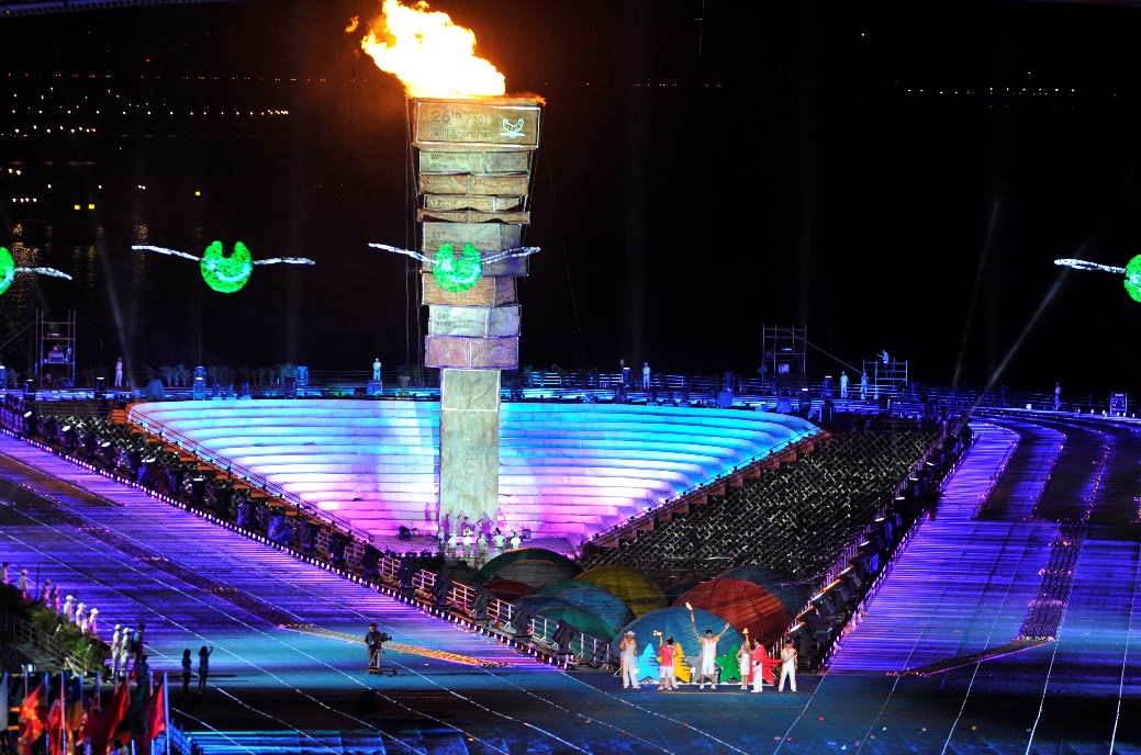 新闻社记者拍摄的刘翔与另四名外国火炬手一起点燃2011年深圳大运会主火炬