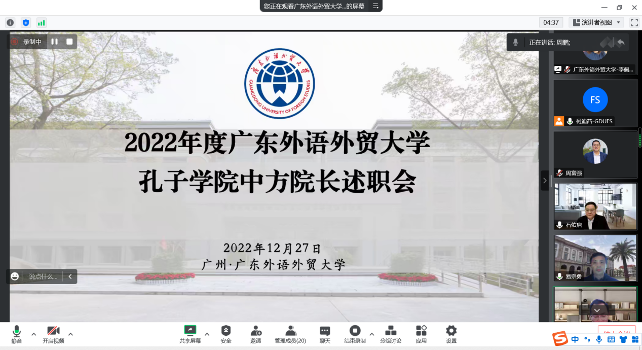 国际交流合作部部长、孔子学院办公室主任周鹏主持会议,并围绕“选好配强孔子学院师资队伍”“推动大湾区孔院联盟建设”“加强与外方合作大学的交流”等方面汇报2022年孔子学院办公室工作情况。同时,他指出2023年将重点加强沟通协调,提升孔院办服务效能;加强与合作大学及当地社区深度互动,助力孔子学院本地化发展;完善网站、公众号等信息平台建设,展示广外孔院风采;搭建孔子学院专业研究平台,探索孔院事业新发展模式;推动孔院联盟率先发展,扩大湾区孔子学院影响力。