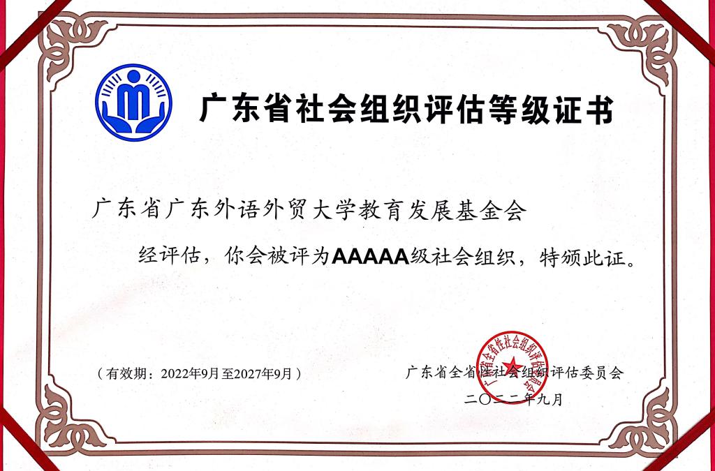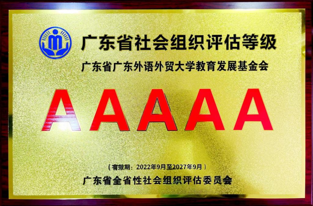 据悉,根据《社会组织评估管理办法》和《广东省民政厅关于开展全省性社会组织评估工作的通知》(粤民函〔2022〕13号)要求,经参评社会组织对照指标自评、第三方评估机构实地考察初评、全省性社会组织评估委员会集体审议终评、公示,最终确定评估等级。广东省广东外语外贸大学教育发展基金会是为数不多获颁教育类5A级等级认证的基金会。