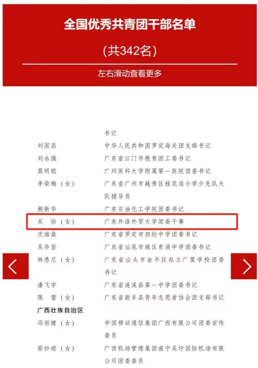 本网讯 2023年是全面贯彻落实党的二十大精神的开局之年。各级团组织和广大团员、团干部凝聚在党的旗帜下,牢记初心使命,充分发挥生力军和突击队作用,涌现出一大批先进典型。在今年五四青年节前夕,共青团中央、团广东省委分别作出表彰决定,表彰各级团组织和广大团员、团干部。其中,我校团委干事吴怡获“全国优秀共青团干部”称号,中文学院团委书记陈泽帆、英文学院团委书记马骁获“广东省优秀共青团干部” 称号,金融学院学子刘若雯、经贸学院学子刘耀庭获“广东省优秀共青团员”称号。