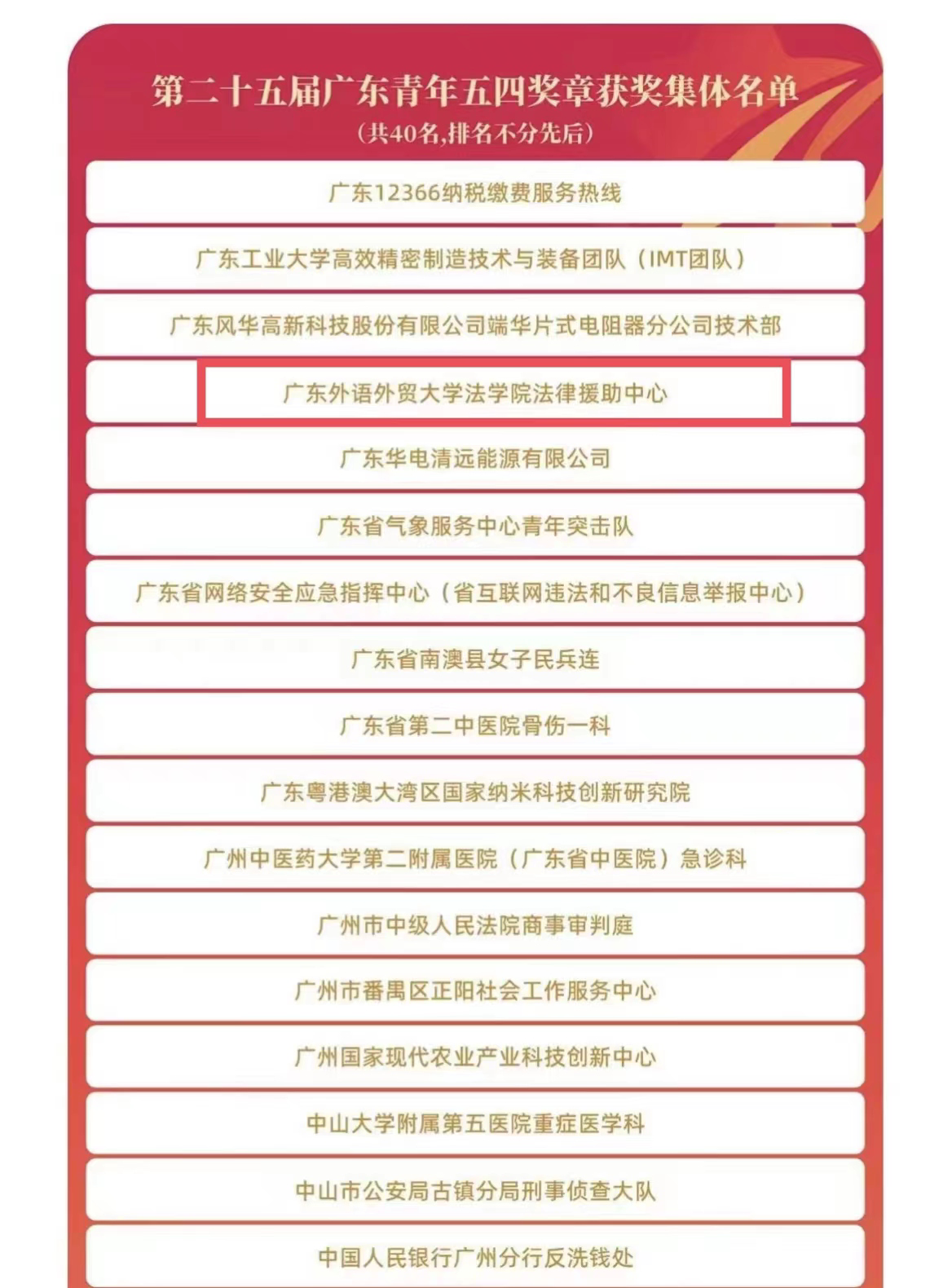 本网讯 近日,共青团广东省委员会、广东省青年联合会公布了第二十五届广东青年五四奖章获奖集体、个人,我校法学院法律援助中心获广东青年五四奖章(集体)。