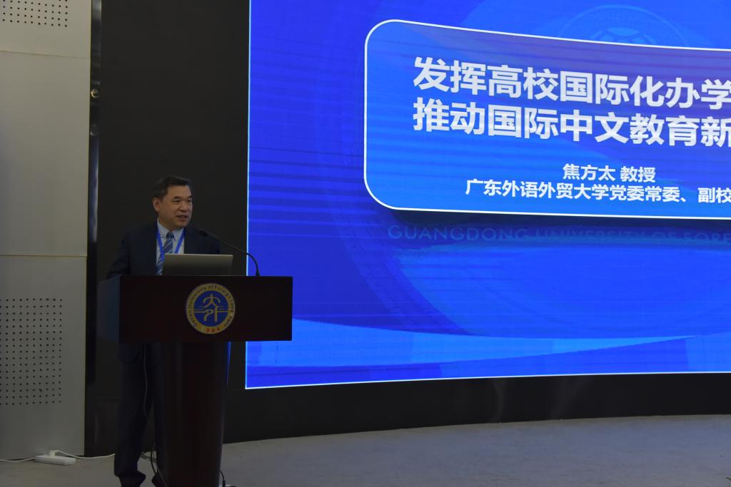 会上,焦方太做了题为《发挥高校国际化办学优势 推动国际中文教育新发展》主旨报告,回顾了国际中文教育发展现状,归纳总结了国际中文教育的发展历程,研判了国际中文教育的发展趋势、机遇及挑战。他还介绍了高校在推动国际中文教育事业上能发挥的语言、学科及专业、资源及平台优势。焦方太随后分享了广外在推动国际中文教育上的实践,包括发挥多语种优势,培养“中文+多语种”国际中文教师后备人才;重视学科交叉融合,打造“中文+专业”国际中文教育品牌;发挥平台机制作用,打造协同发展合作共赢生态圈;利用国际资源优势,打造“一带一路”交流合作网络等。他认为,推动国际中文教育事业发展,外语院校“大有可为”。高校应共享国际交流资源,搭建国际中文教育全球化平台,促进高校国际中文教育的协同发展。