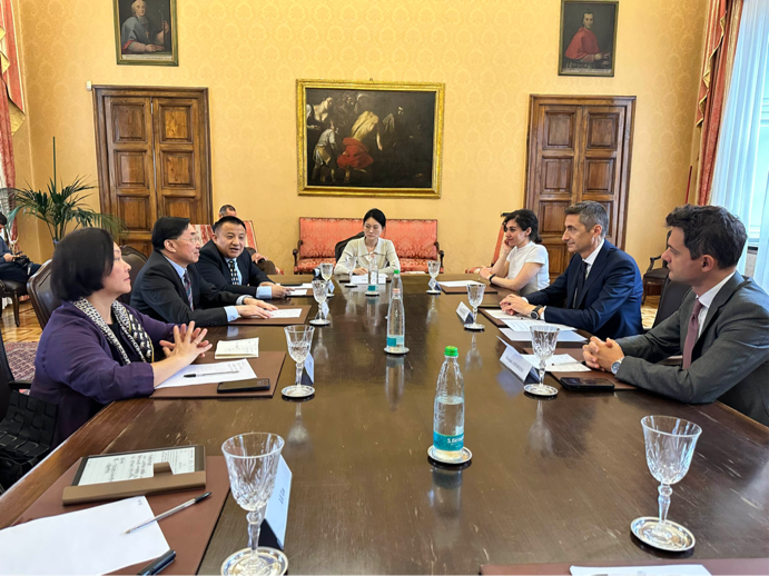 在意大利罗马一大,李云明一行与罗马一大东方学系汉语语言文学教授、著名汉学家马西尼(Federico Masini)等亲切会晤。双方就推动学生交换项目覆盖至法学、经济、管理等更多学科达成初步合作意向。同时,双方探讨了如何加强在中国问题研究、中意翻译研究等方面的合作,并就学生联合培养、学者交流计划,联合开展欧亚校园项目、推荐孔子学院意大利合作院校资源等进行了深入探讨。