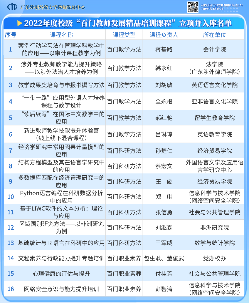 为统筹把握习近平总书记关于教育的重要论述与强化贯彻新发展理念、推动高质量发展,中心贯彻执行好“学思践悟抓好理论学习”。“百门课程”自4月13日起正式启动,每周平均开课3至4讲。其中,“百门职业素养”,不仅使各单位党政办和管理服务团队人员深刻认识“教育、科技、人才”在全面建设社会主义现代化国家中的基础性、战略性支撑作用,还帮助他们提高对落实立德树人这一根本任务的思想觉悟。切实增强他们为党育人,为国育才的使命感、责任感。与此同时,也进一步提升了党政办管理服务工作精细化水平,为加快实现推进学校治理体系和治理能力现代化、筑牢新发展理念、助力学校事业高质量发展等重要目标起到了推动作用。“百门科研方法”不仅进一步提升教师运用党的创新理念解决实际问题的能力,也为教师科研水平的提高起到了积极作用,增强教师们为推动大学科研事业发展而奋斗的信心。“百门教学方法”紧紧围绕教法改革、课程思政等中心环节,注重理论学习指导实践,帮助教师在教学相长中切实提升教学水平和人才培养质量,为培养广外“金师”提供智力支撑与人才力量。