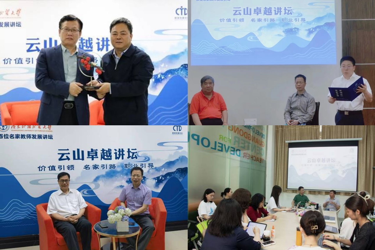 “百位名家教师发展论坛”通过各类名家讲座、沙龙类活动,为打造能“冲一流”的高素质教师队伍提供专家指导。该发展论坛不仅聚焦于提升教师教学质量、提高科研能力与发展综合素养,还着眼于通过开展了校内外多样化交流,提升师资团队的发展效能。其中“云山卓越讲坛”作为重点打造的高端论坛,以访谈对话形式,由主讲人与现场教师就教学生涯、学术生涯进行经验交流与分享。主讲人均是校内外各专业领域首席专家或领军学者,针对青年教师的人生道理进行指导和解惑,以实现对青年教师的“价值引领、名家引路、职业引导”。胡开宝强调教师首先应坚定自己的信念,保持积极的心态,为自己塑造清晰的学术面貌;王战勉励“青椒”回应国家需要,始终和学科前沿保持一致;林桂军强调从国家发展形势中的重要问题为基本出发点,追求卓越、步履不停;唐润华强调问题意识来自一线调研,磨杵成针、永不松懈。参加论坛的青年老师们纷纷反映新的形式和内容“气氛很好”“收获很大”。