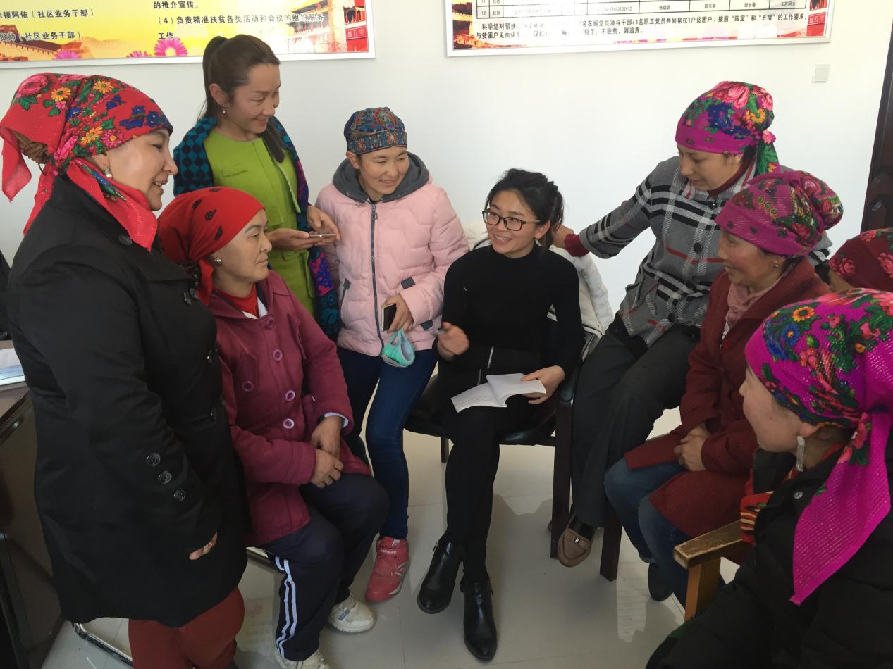 邵书琴与社区妇女开会宣传惠民政策