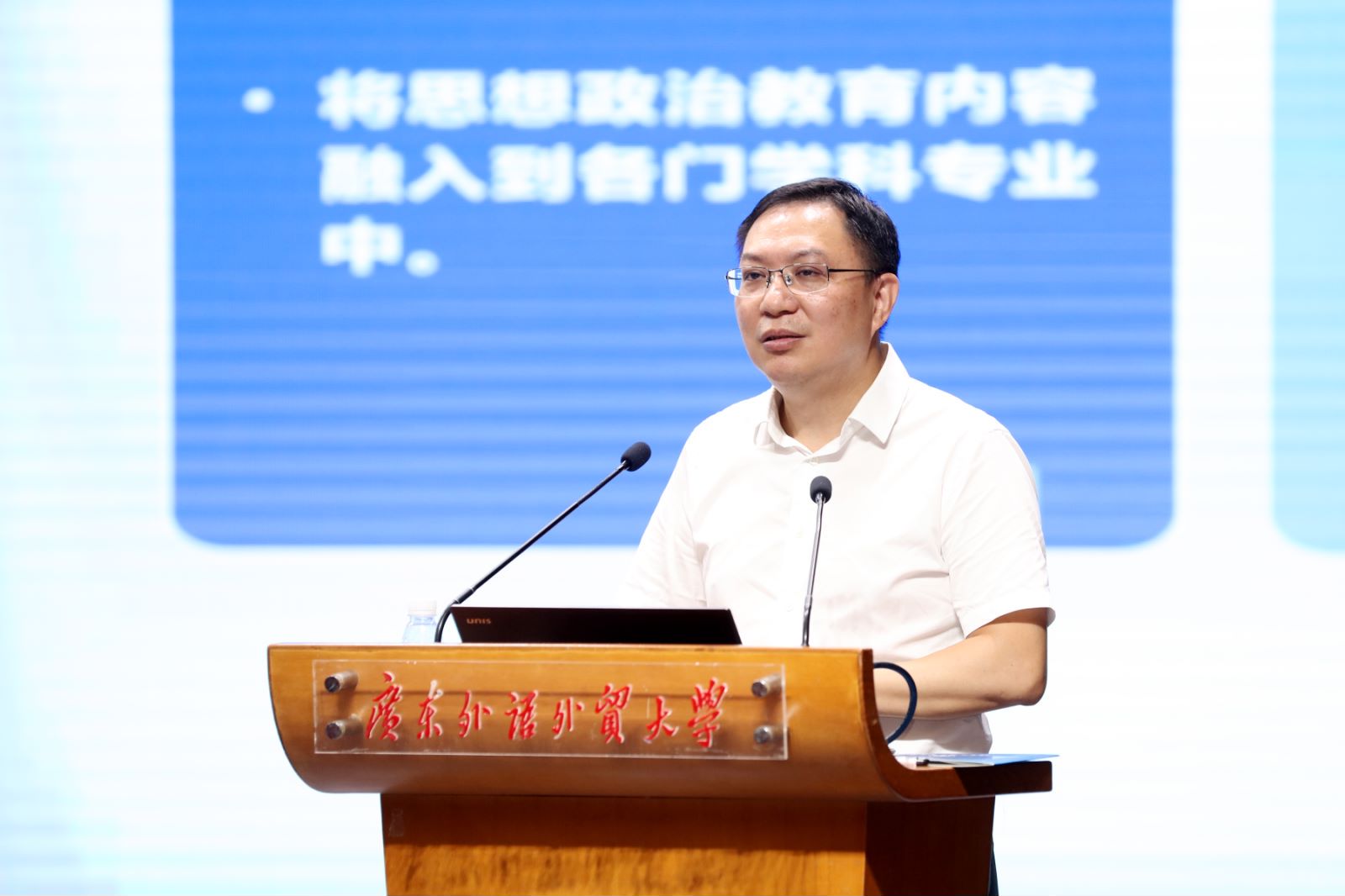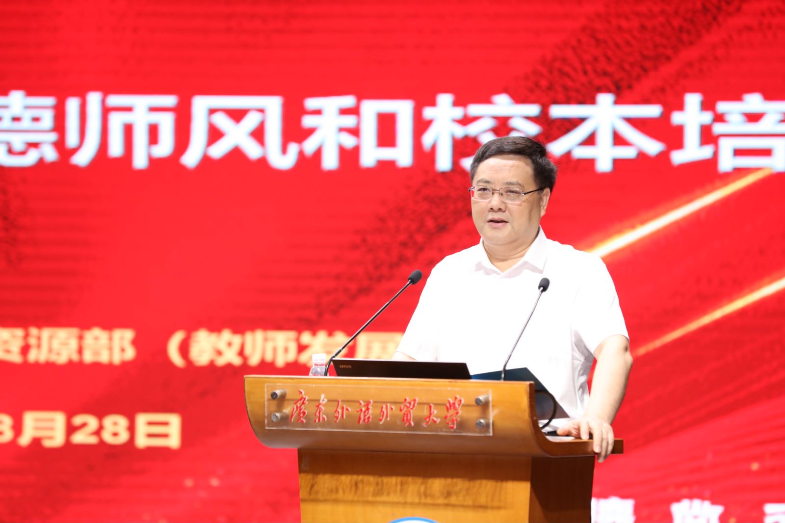 石佑启对新入职教职工表示欢迎和祝贺。他回顾建校历史、畅谈广外特色、细数广外成绩、构想广外蓝图,从何为广外、何以为师两个方面开启岗前培训第一课。他指出,当前广外已整体进入广东省高水平大学重点建设高校行列,将继续坚持守正创新,秉承“明德尚行、学贯中西”的校训精神,践行“卓越、诚信、包容、自信”的广外价值观,弘扬“进德、修业、务实、致远”的广外学风,培养拥有家国情怀、国际视野、过硬本领、创新能力、担当精神的国际化高素质人才。石佑启强调,全体广外人是一个事业共同体、发展共同体、情感共同体、生命共同体。学校坚持质量立校、人才强校、科研兴校、文化润校、依法治校。广大教育工作者要牢记习近平总书记对新时代教师的殷切希望和要求,做到“四个相统一”,争做“四有”好老师,做学生的“四个引路人”。他指出,育人之路,行稳致远;为人师者,从教以真;育人育才,服务大局。做新时代的“大先生”,要落实立德树人根本任务,做守初心、敢竞先、有担当的“师者”;要沉下心来,到学生中去、到团队中去、到真知中去,致力于做真学问、解决真问题;要胸有“大情怀”、拓宽“大视野”、作出“大贡献”,志存高远、追求卓越,坚持以“国家所需、未来所向、湾区所急、广外所能”为导向,发挥“多语种”和“多学科”优势,为国家经济社会高质量发展提供人才支撑和智力支持。