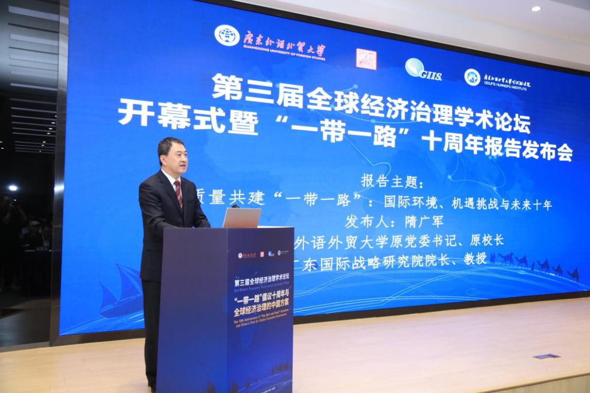 2023年10月8日,在第三届全球经济治理学术论坛上,广外党委书记石佑启教授指出,当今世界政治经济秩序持续发生深刻变化,“一带一路”倡议为维护全球自由贸易体系和开放型世界经济,为推动文明交流互鉴、世界和平发展增添新动能。广外原党委书记、原校长、广东国际战略研究院院长隋广军教授在论坛上发布了《“一带一路”十周年研究报告——高质量共建“一带一路”:国际环境、机遇挑战与未来十年》。该报告围绕高质量共建“一带一路”的主题,总结了十年经验、分析了当前国际环境及其机遇和挑战,并提出了“一带一路”未来发展的建议。中国大运河智库联盟暨重庆智库研究院院长、首席研究员王佳宁作点评时说,“报告在站位上清晰表达了中国在新时代的全球治理观念,强调共同发展、共同安全和共同交流,展现了鲜明的行动和成果。”
