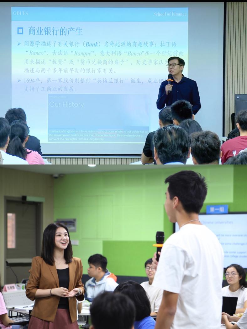 活动分为公开课和教学研讨两个环节,由教务部部长陈金诗主持。金融学院教授杨菁菁和英语教育学院范栩颖博士进行了现场教学展示。杨菁菁为同学们讲授了金融学专业核心课程的“银行业与金融机构管理”章节,针对党的二十大报告提出的“守住不发生系统性风险底线”,以“现身说法”分享了相关理论知识与思考。范栩颖为同学们讲授了综合英语课程中的“College Life”单元。她通过文本分析的方法,帮助同学们理解描述性语言的用途和目的,从而提升阅读体验,让他们深刻地理解作品中人物的心理活动。