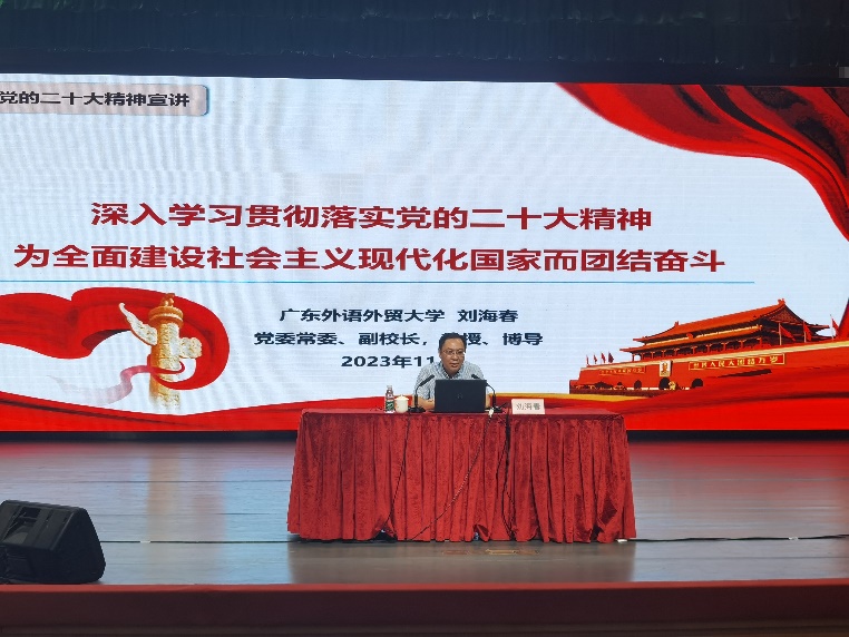 学校党委常委、副校长刘海春教授给学员上第一节专题党课。刘海春以“深入学习贯彻落实党的二十大精神,为全面建设社会主义现代化国家而团结奋斗”为题,从战略全局、国际形势方面深刻阐述了新时代坚持和发展中国特色社会主义的一系列理论和实践问题,并从党的二十大召开时代背景、重大意义、深远影响、主要内容和精神实质等方面进行深刻阐释,深入学习贯彻党的二十大精神,引导学员把党的二十大精神转化为指导实践、推动工作的强大力量。