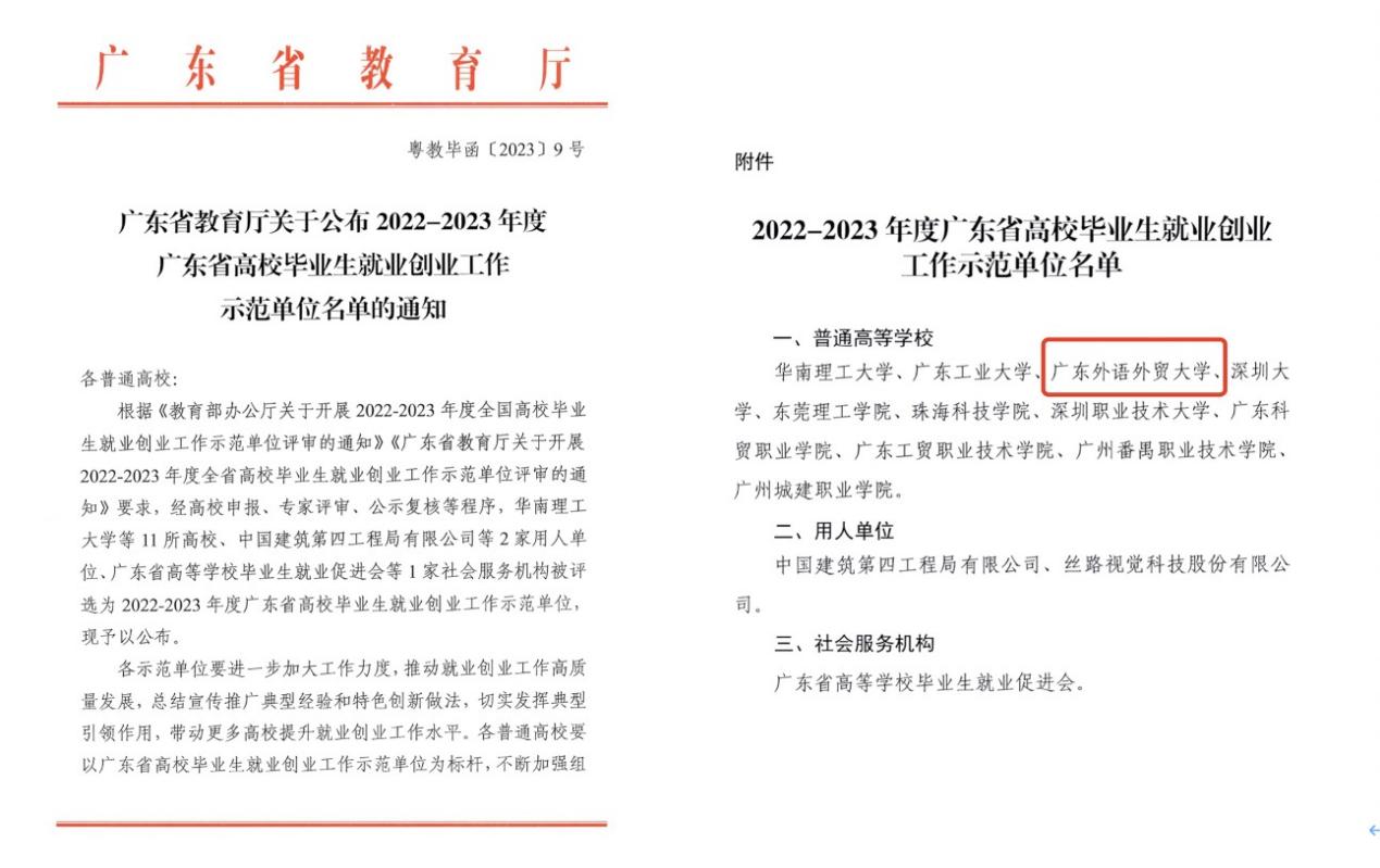 本网讯 近日,广东省教育厅印发《关于公布2022-2023年度广东省高校毕业生就业创业工作示范单位名单的通知》(粤教毕函〔2023〕9号),我校被评为“2022-2023年度广东省高校毕业生就业创业工作示范单位”。