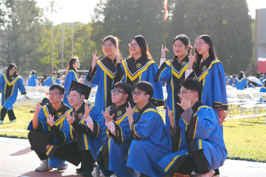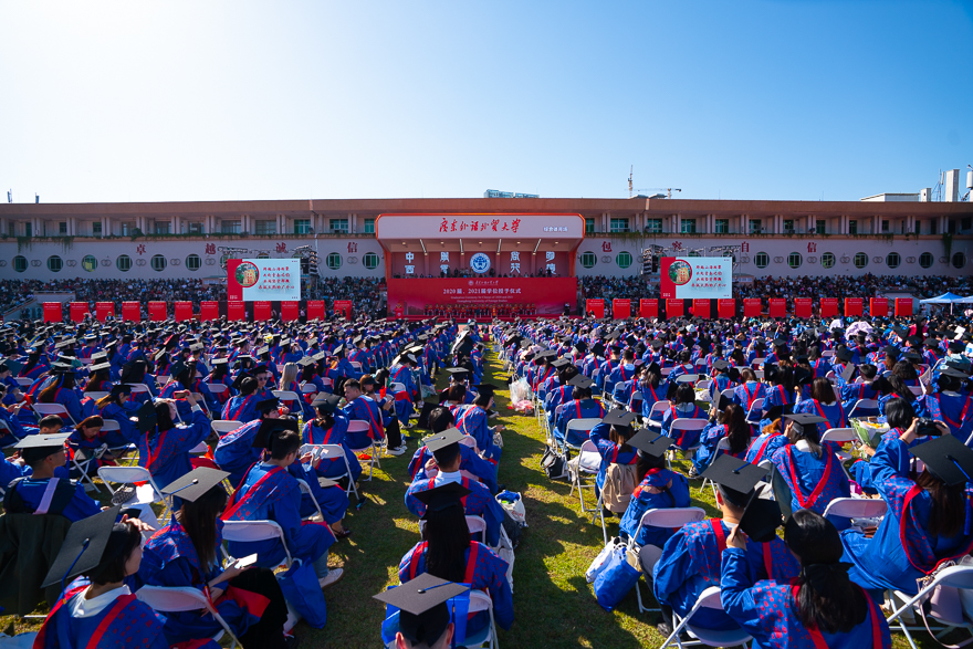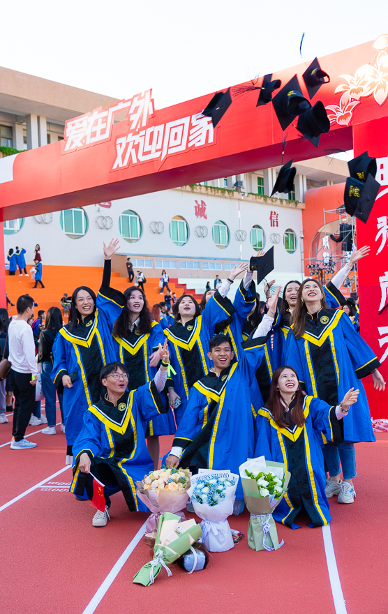 在全体毕业生宣誓后,校领导、主礼教授为每一位返校的2020届、2021届校友拨穗授礼,合影留念,为同学们在广外的青春岁月画上圆满的句号。