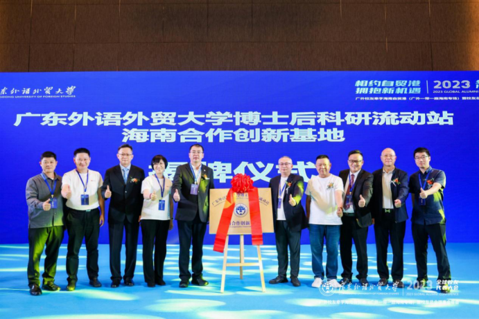 会上,在校友们的见证下,举行了“广东外语外贸大学博士后科研流动站海南合作创新基地”揭牌仪式,标志着广外与海南的合作更上一层楼。