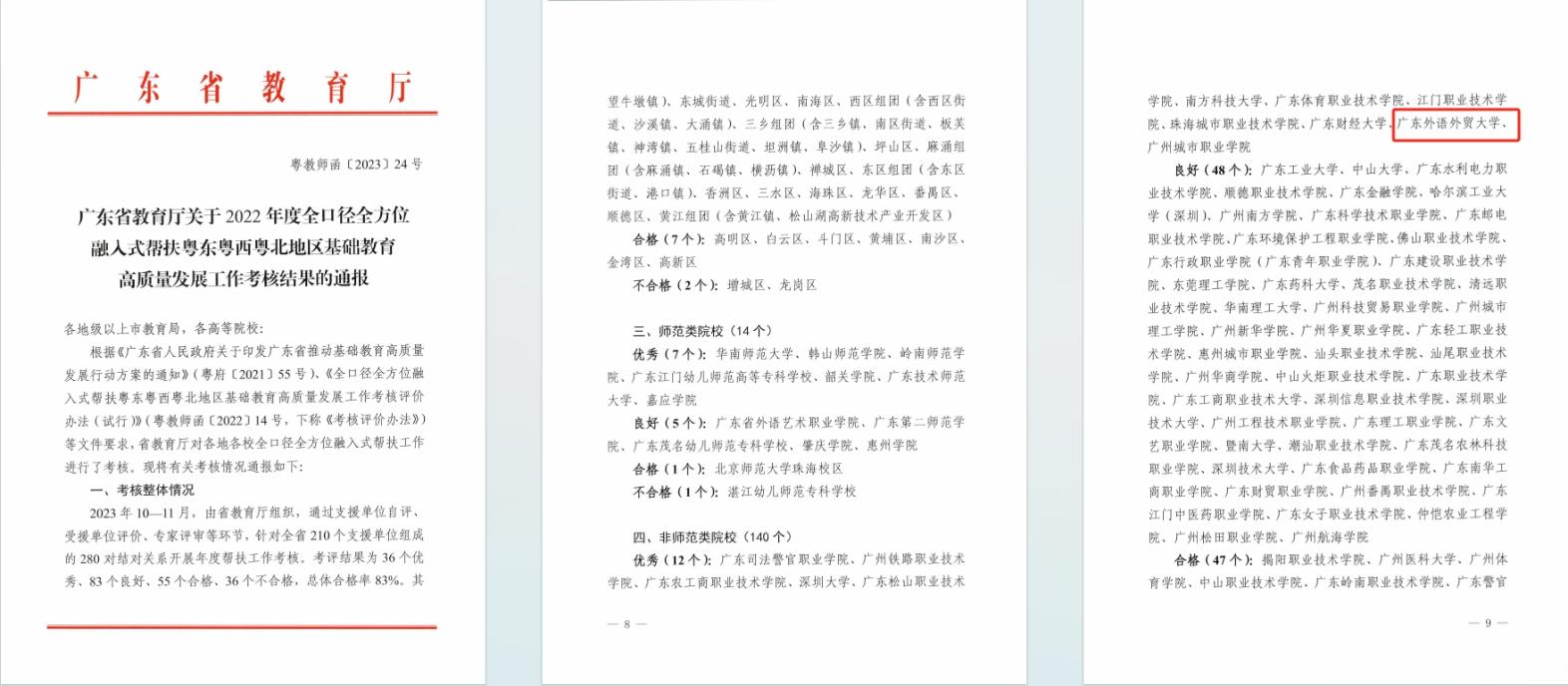 本网讯 近日,广东省教育厅印发《广东省教育厅关于2022年度全口径全方位融入式帮扶粤东粤西粤北地区基础教育高质量发展工作考核结果的通报》(粤教师函〔2023〕24号),我校被评为“优秀”等级。