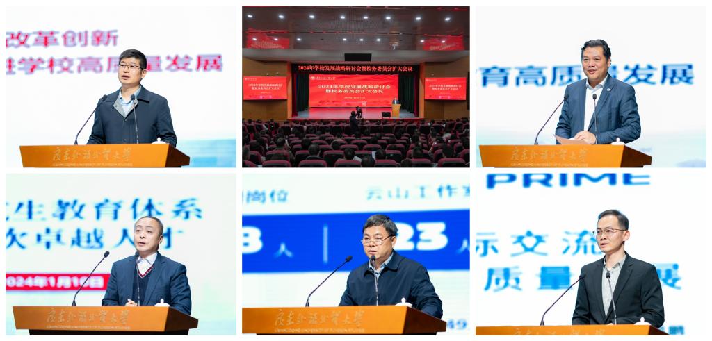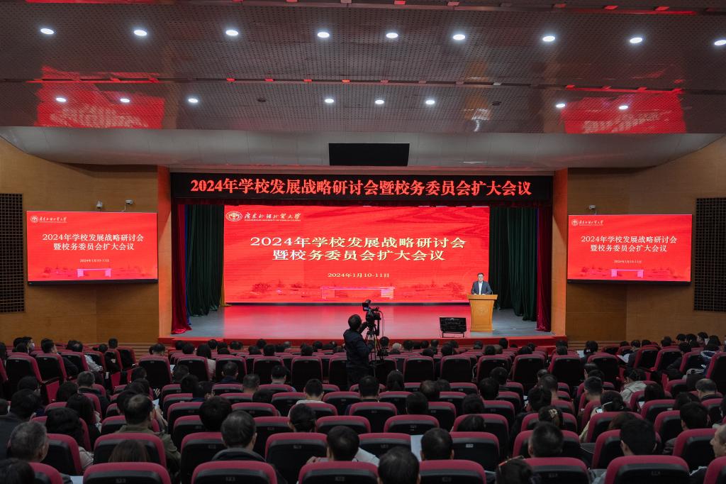 本网讯 1月10日至11日,学校在白云山校区六教报告厅召开2024年学校发展战略研讨会暨校务委员会扩大会议,研讨学校事业实现高质量发展的方向和路径。校党委书记石佑启主持会议并作总结讲话,校长闫相斌以“求新思变 聚势而为 奋力开创学校事业高质量发展新局面”为题作主题报告。校领导、校务委员、校学术委员会委员、全校副处职(级)以上干部、系(部)主任代表,各教学、科研、教辅单位办公室主任,党政群部门科长参加会议。