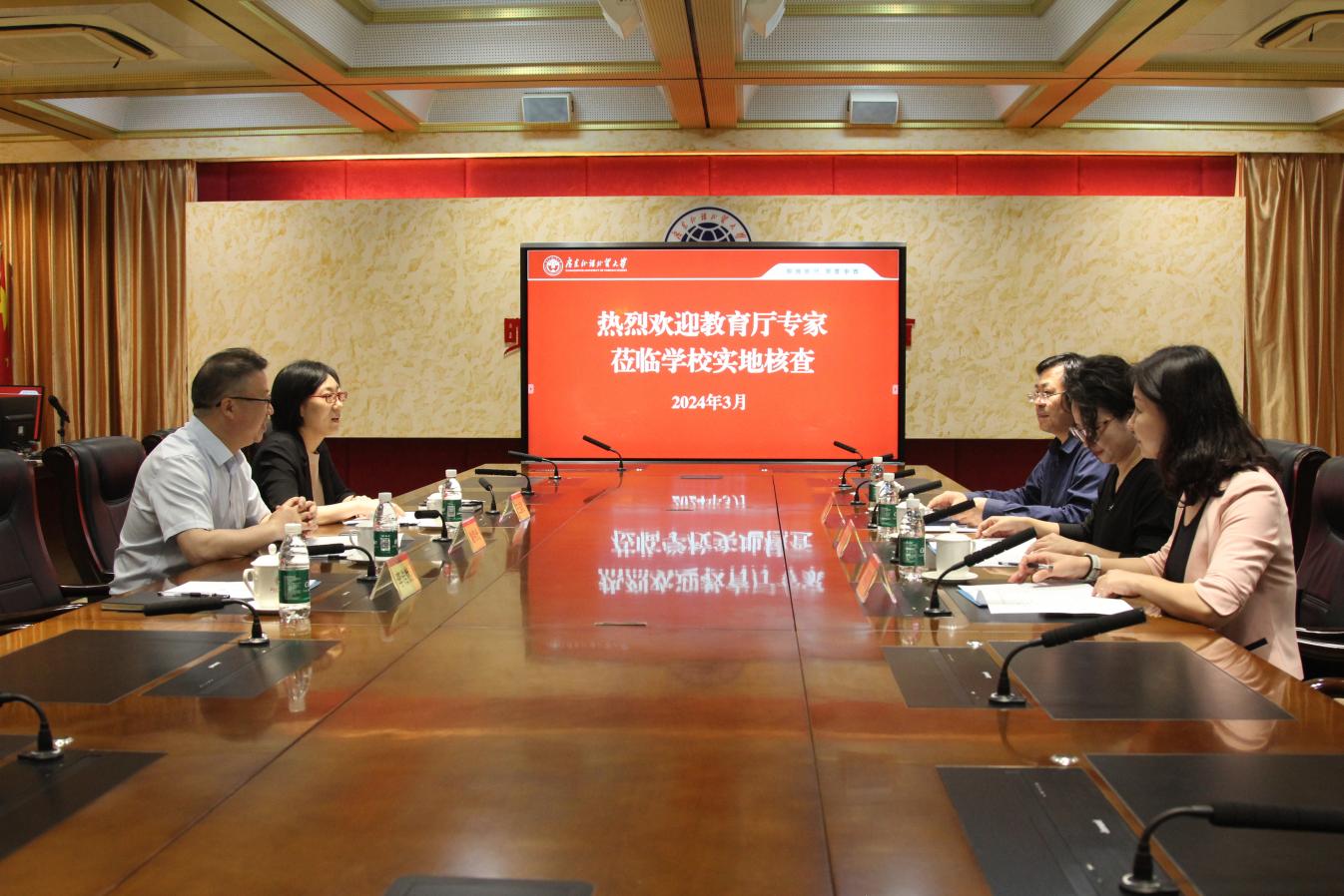 本网讯 3月27日,省教育厅专家组对我校申报全国、全省依法治校示范校进行实地核查,包括听取汇报、材料核查、调研访谈等环节。校党委书记石佑启在迎宾厅与专家组进行了座谈。
