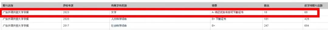 本网讯 2024年4月,RCCSE《中国学术期刊评价研究报告》(第7版)正式发布,《广东外语外贸大学学报》被评为“RCCSE中国核心学术期刊”,本刊在所有60本文学专业期刊当中排名靠前,居于第18名的位置,取得了1990年办刊历史以来新的突破。