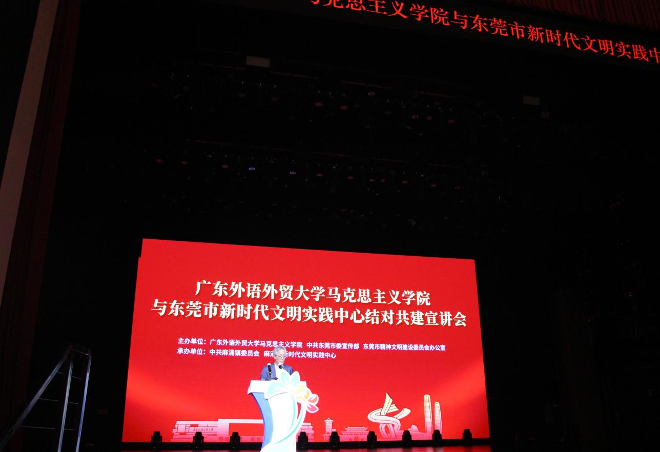 本网讯 为充分发挥首批广东省重点马克思主义学院示范引领作用,切实做好习近平新时代中国特色社会主义思想基层宣传工作,4月11日,广东外语外贸大学马克思主义学院与东莞市新时代文明实践中心结对共建宣讲会在东莞市新时代文明实践中心举行。我校党委副书记唐锐,马克思主义学院院长毛国民、党委书记麦培年,东莞市委宣传部常务副部长赵国锋等领导和专家学者出席宣讲会。