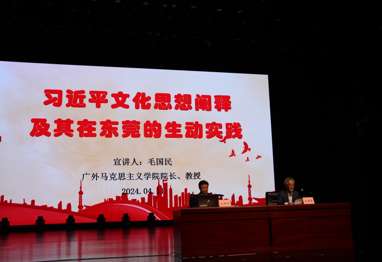 毛国民作《习近平文化思想阐释及其在东莞的生动实践》专题宣讲报告。在报告中,毛国民首先简要梳理了“习近平文化思想”提出的时代背景、理论渊源与形成过程,还重点从“九个坚持”、“十四个强调”、“七个着力”的内容解读了习近平文化思想的丰富内涵,阐释了习近平文化思想的理论特征及重大意义。其次,结合东莞文化建设的生动实践,就如何把打造东莞成“品质文化之都”的问题,从强调马克思主义在意识形态领域指导地位、坚定文化自信、培育和践行社会主义核心价值观等三个层面进行分层阐述。最后,从把握方向、找到好“素材”、找准目标、找到好方法和贯彻落实等五个部分,系统阐述如何化道为器把习近平文化思想落实为行动指南。在毛国民院长的诠释下,原本高深的理论变得浅显易懂、生动有趣,引发了在场人士的热烈掌声。许多听众在聆听的同时,还认真地记录着笔记。