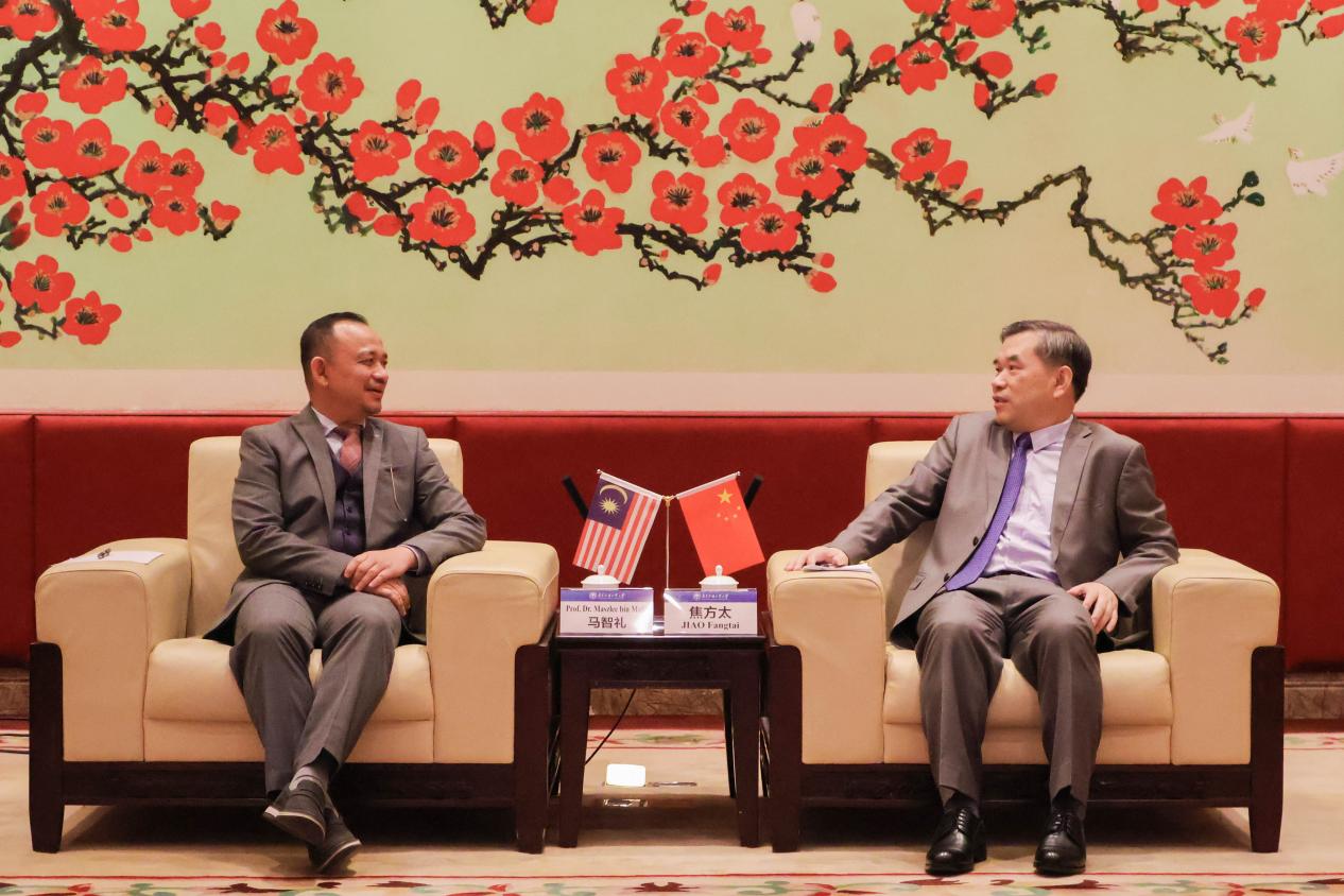 焦方太热烈欢迎代表团的到来,并详细地介绍了广东外语外贸大学的建校历程、国际交流合作成果以及马来语专业建设的详细情况。他指出,广东外语外贸大学是广东省高水平大学重点建设高校,具有鲜明的国际化特色,与马来西亚高校以及机构在人才培养和学术交流等方面开展了多次合作。学校在外国语言文学教学与研究等领域具备显著优势,其中马来语专业是教育部非通用语本科人才培养基地之一,其办学成果在全国同类专业中名列前茅。他表示,广外高度重视与马来西亚高等学校的合作关系,并热切期待未来能够开辟更多的合作新篇章,进一步深化双方在文化和教育领域的交流,共同培养更多具备高素质的人才,为中马两国之间的友谊与交流搭建更为坚实的桥梁。