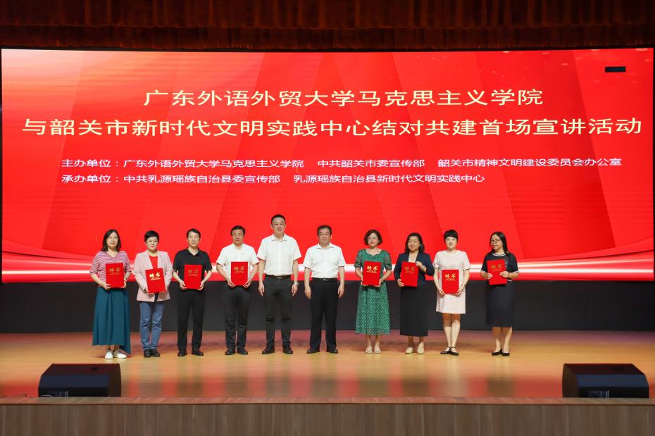 5月9日,马克思主义学院与韶关市新时代文明实践中心结对共建首场宣讲活动在乳源县总工会举行,韶关市委宣传部常务副部长黄勤昌出席活动。活动上,唐锐与黄勤昌首先为我校8名专家颁发聘书。随后,马克思主义学院院长毛国民教授以《化道为器,谱写文化韶关新篇章》为题进行首场宣讲。