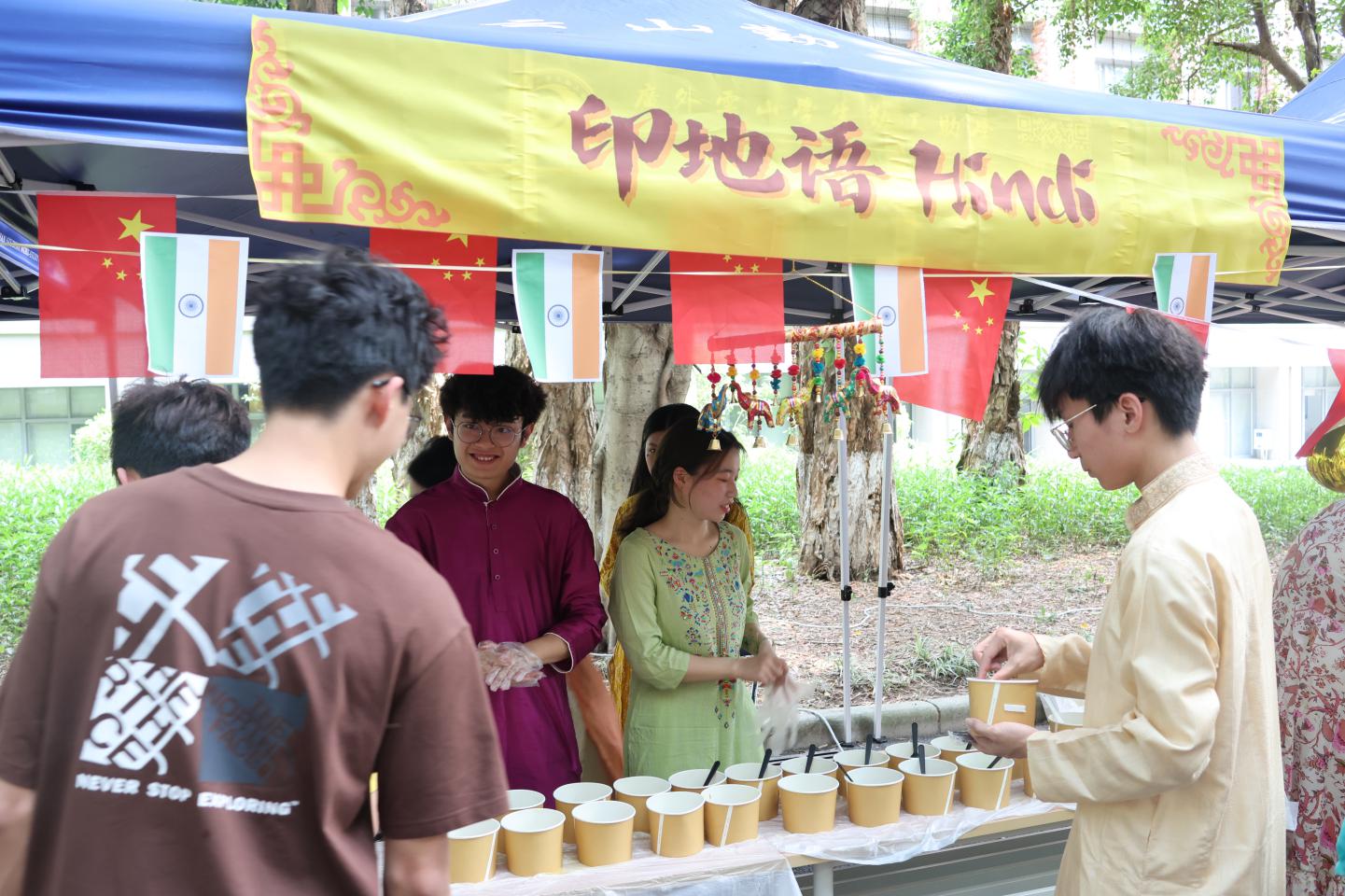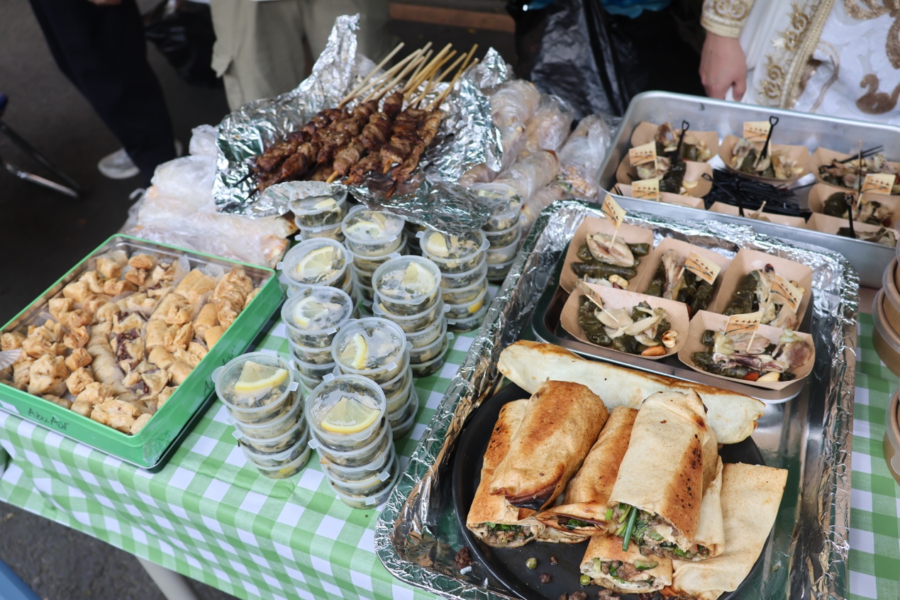 美食集市上,各语系学生身穿对象国的特色服饰,在摊位上精心准备对象国的经典美食,吸引来客前来品尝。有来自阿拉伯的沙瓦玛卷饼,伊朗的藏红花鸡汤,朝鲜族的辣炒年糕,坦桑尼亚的羊肉抓饭,土耳其的米布丁,巴基斯坦的灌汤脆球,希伯来语的法拉费丸子,印度的咖喱料理,孟加拉国的特色小吃拼盘等不同地域的美食。此外本次文化节还联合了中国文化摊位,共同欣赏中文书法,感受中华美食。参与者沉浸在多元文化之中,领略不同文化的魅力。