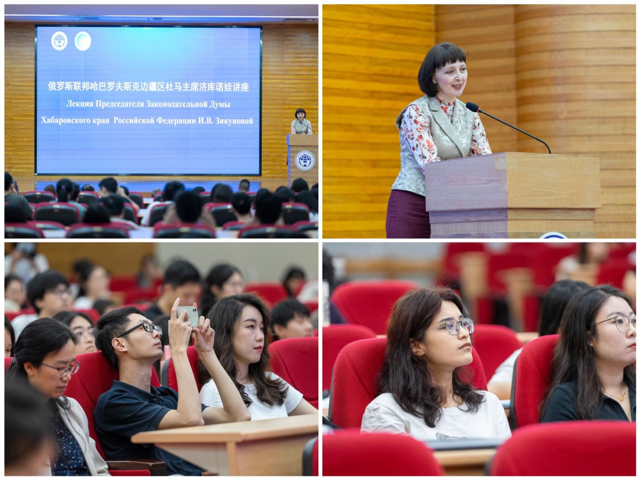 济库诺娃在我校白云山校区图书馆报告厅为西语学院俄语系、经贸学院师生约200人做经济学主题讲座,从历史、经济、政治和国际关系等方面深入探讨了维护和加强国家主权的途径及挑战。在自由提问环节,济库诺娃主席与现场同学展开了积极互动交流。同学们踊跃提问,济库诺娃认真倾听,并就学生们提出的中俄未来会在哪些领域加强合作、如何看待俄联邦总统普京继任后首访中国、俄罗斯在当前形势下如何制定并完成经济发展任务、中俄经贸务实合作有哪些新特点和新亮点等问题进行了详细解答。讲座最后,济库诺娃对同学们提出了殷切期望,鼓励大家在中俄合作背景下充分发挥自身专业优势,助力中俄合作交流。本次讲座在热烈的掌声中圆满落幕。