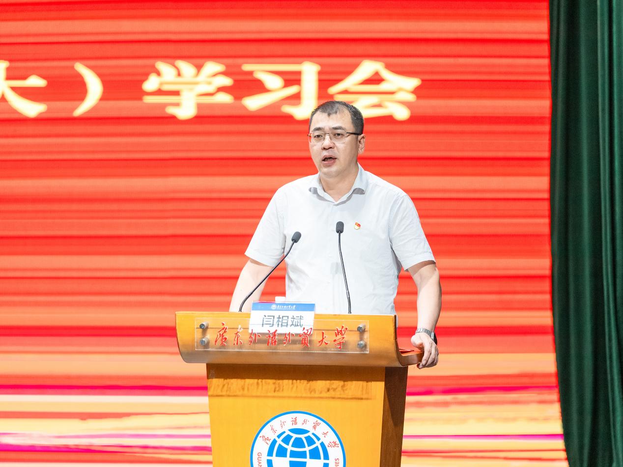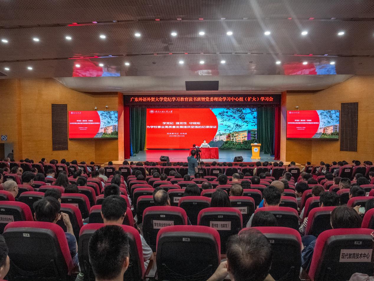 本网讯 5月23日,我校党纪学习教育读书班暨党委理论学习中心组(扩大)学习会在白云山校区六教报告厅召开。在开班仪式上,校党委书记石佑启讲授纪律党课,校长闫相斌主持会议,校党委常委、纪委书记、监察专员温燕欢作党纪学习教育专题辅导报告。校党委理论学习中心组成员、校党委委员、纪委委员、副处职级以上干部,党政机关、教辅单位科长(主任),教学、科研单位办公室主任,后勤实体主要负责人,广州市实验外语学校、白云外国语中小学主要负责人参加学习会。