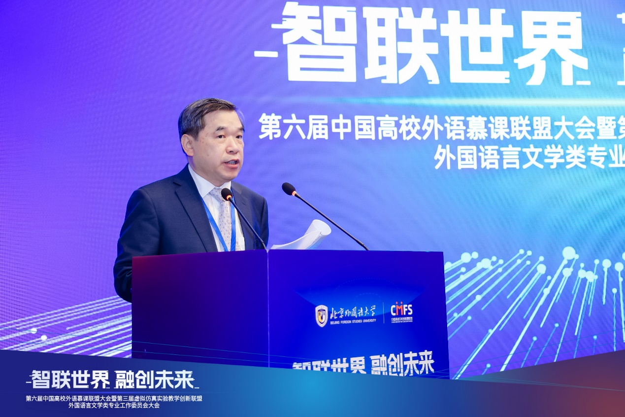 本网讯 6月15日,以“智联世界 融创未来”为主题的第六届中国高校外语慕课联盟大会暨第三届虚拟仿真实验教学创新联盟外国语言文学类专业工作委员会大会在京召开。全国高校200余位专家学者齐聚一堂,围绕教育数字化转型变革,新时代背景下创新外语教学模式、提升人才培养质量等主题进行深入探讨。我校党委常委、副校长焦方太作为中国高校外语慕课联盟常务理事单位代表受邀参会并致辞。